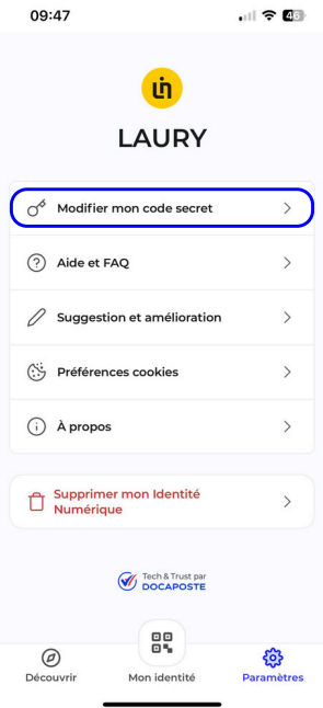 Je clique sur "Paramètres" puis "Modifier mon code secret" dans les paramètres en bas à droite,