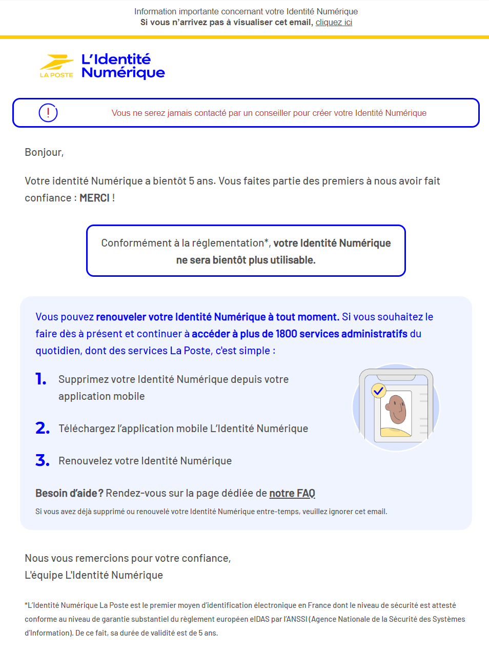 Vous venez de recevoir un e-mail qui vous indique que votre Identité Numérique La Poste ne sera bientôt plus utilisable car sa durée de validité est de 5 ans.